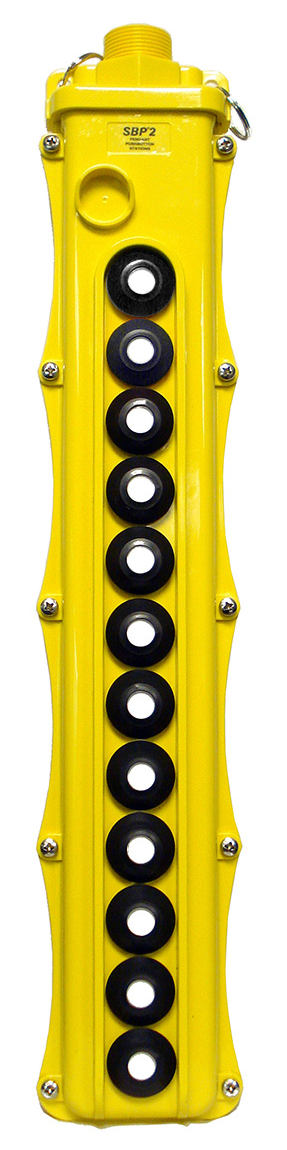 - Enclosure Material: Housings of the SBP2 pendant pushbutton station are made from polycarbonate, an impact resistant polymer material. This material has proven durable in most industrial environments. Like all plastics, it is susceptible to some chemicals. In particular, some machine shop cutting fluids and wire drawing lubricants can lead to cracks in the housings. Polyamide (nylon) housings are available as an option for these applications.
