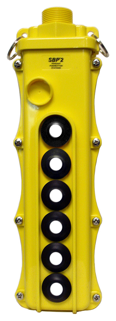 - Enclosure Material: Housings of the SBP2 pendant pushbutton station are made from polycarbonate, an impact resistant polymer material. This material has proven durable in most industrial environments. Like all plastics, it is susceptible to some chemicals. In particular, some machine shop cutting fluids and wire drawing lubricants can lead to cracks in the housings. Polyamide (nylon) housings are available as an option for these applications.