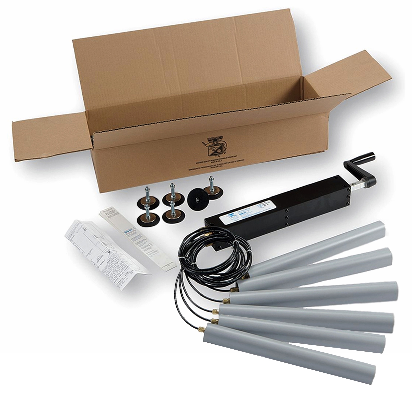 • Smooth quiet operation. Manual fold-away handle requires 5 handle rotations per inch of travel.